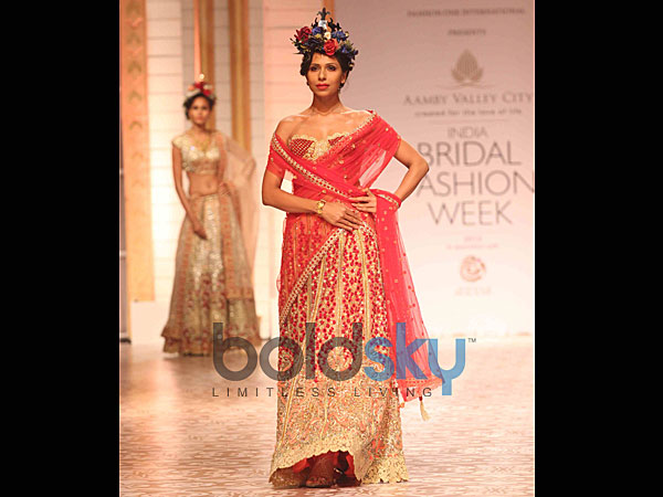ಭರ್ಜರಿ ಕಸೂತಿ ಹೊಂದಿದ್ದ ಸಾಂಪ್ರದಾಯಿಕ ಕೆಂಪು ಬಣ್ಣದ ಲೆಹಂಗಾಕ್ಕೆ ಕನ್ನಡಿಯ ಕಸೂತಿಯನ್ನು ಮಾಡಲಾಗಿತ್ತು. ಸ್ಟ್ರಾಪ್ ಲೆಸ್ ಬೊಡೈಸ್ ಲೇಸ್ ಹೊಂದಿತ್ತು. ಲೆಹಂಗಾದಲ್ಲಿ ಚಿನ್ನದ ಮತ್ತು ಕನ್ನಡಿಯ ಕಸೂತಿಯನ್ನು ಕಾಣಬಹುದಿತ್ತು. ಇದನ್ನು ದೆಹಲಿಯ ಶೋನಲ್ಲಿ ಕೂಡ ಪ್ರದರ್ಶಿಸಲಾಗಿತ್ತು.
