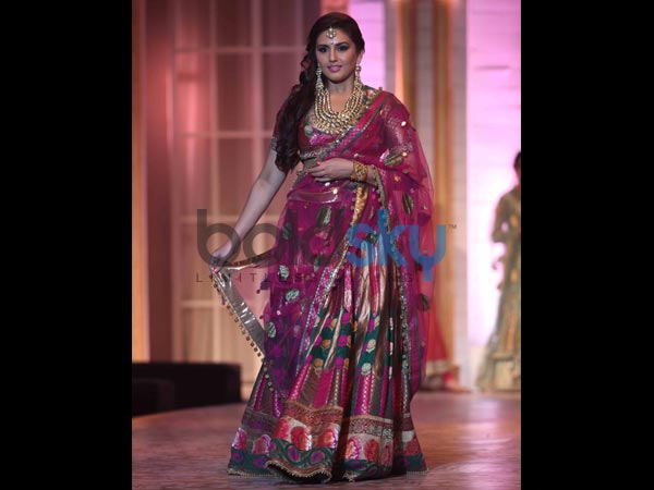 ಬಣ್ಣದ ಲೆಹಂಗವನ್ನು ಸೀರೆಯ ಹಾಗೆ ತೊಡಲಾಗಿತ್ತು. ಇದು ಅಶಿಮ ಮತ್ತು ಲೀನ ವಿನ್ಯಾಸದ ಅತ್ಯುತ್ತಮ ಉಡುಪಾಗಿತ್ತು.