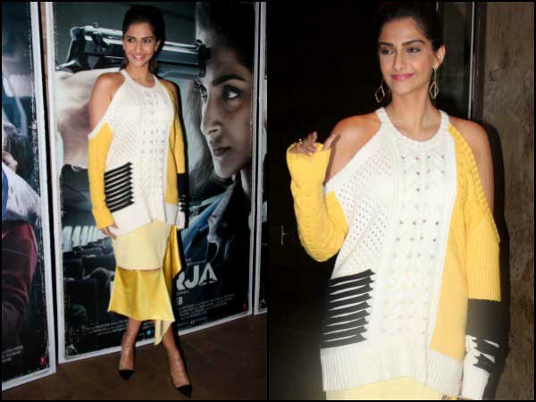 ತಮ್ಮ ಮುಂಬರಲಿರುವ ಚಿತ್ರ ನೀರಜಾ ಪ್ರಮೋಷನ್ ಕಾರ್ಯಕ್ರಮದಲ್ಲಿ ಸೋನಂ ಈ ಬಾರಿ ನಮ್ಮನ್ನು ಮನಸೋಲುವಂತೆ ಮಾಡಿದ್ದಾರೆ. ಪ್ರಬಲ್ ಗುರಂಗ್ ವಿನ್ಯಾಸ ಪಡಿಸಿದ ಸ್ವೆಟರ್ ಮತ್ತು ಸ್ಯಾಟಿನ್ ಸ್ವೆಟರ್ ಮಿಶ್ರಣದ ದಿರಿಸು ಆಕೆಯ ಮೈಯನ್ನು ಅಪ್ಪಿಹಿಡಿದಿರುವಂತ್ತಿದೆ. ಹೊಸ ಮಾದರಿಯ ಸ್ವೆಟರ್ ವಿನ್ಯಾಸ ಇದಾಗಿದೆ ಎಂದೇ ಹೇಳಬಹುದಾಗಿದ್ದು ಸೋನಂರ ಸಪೂರ ಮೈಕಟ್ಟಿಗೆ ಇದು ಒಪ್ಪುವಂತಹದ್ದಾಗಿದೆ.