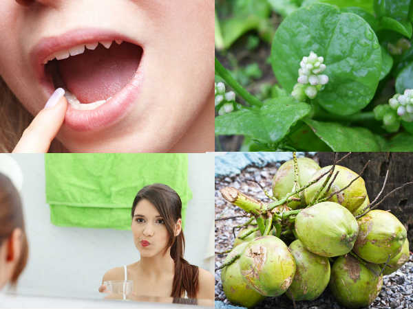 ಎಳನೀರು ಕುಡಿಯುವುದು ಬಾಯಿ ಹುಣ್ಣು ಕಡಿಮೆ ಮಾಡುವಲ್ಲಿ ಸಹಕಾರಿ. ಖಾರ ತಿಂದು ಬಾಯಿ ಹುಣ್ಣಾಗಿದ್ದರೆ ದಿನದಲ್ಲಿ 2 ಎಳನೀರು ಕುಡಿಯಿರಿ. ಬೇಗನೆ ಗುಣಮುಖವಾಗುವಿರಿ.