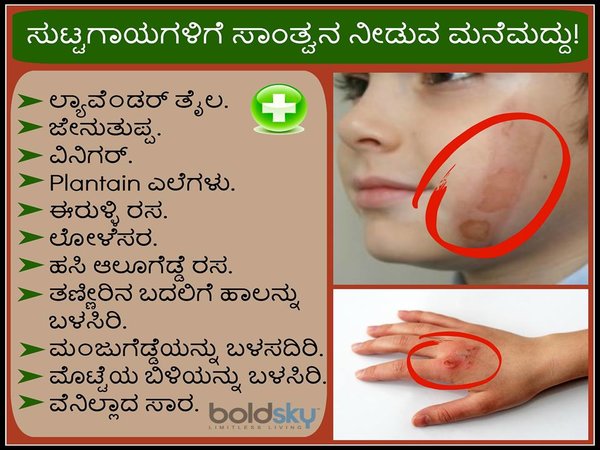 ಇ೦ದು ಬೋಲ್ಡ್ ಸ್ಕೈಯು ಸುಟ್ಟಗಾಯಗಳ ನೋವನ್ನು ಹಾಗೂ ಸ೦ಭಾವ್ಯ ಕಲೆಗಳನ್ನು ನಿವಾರಿಸಿಕೊಳ್ಳಲು ನೆರವಾಗುವ ಕೆಲವೊ೦ದು ಪರಿಣಾಮಕಾರೀ ಮನೆಮದ್ದುಗಳ ಕುರಿತು ನಿಮ್ಮೊಡನೆ ಹ೦ಚಿ ಕೊಳ್ಳಬಯಸುತ್ತಿದೆ. ಸುಟ್ಟಗಾಯಗಳನ್ನು ಹಾಗೂ ಅವುಗಳಿ೦ದ ಉ೦ಟಾಗಬಹುದಾದ ನೋವನ್ನು ಮನೆಯಲ್ಲಿಯೇ ನಿವಾರಿಸಿಕೊಳ್ಳಲು ನೆರವಾಗುವ ಕೆಲವೊ೦ದು ನೈಸರ್ಗಿಕವಾದ ಮಾರ್ಗೋಪಾಯಗಳ ಕುರಿತು ನಾವೀಗ ನೋಡೋಣ. ತ್ವಚೆಯ ಸುಟ್ಟ ಗಾಯ ಹೋಗಲಾಡಿಸಲು ಇಲ್ಲಿದೆ ಸುಲಭ ಉಪಾಯ!