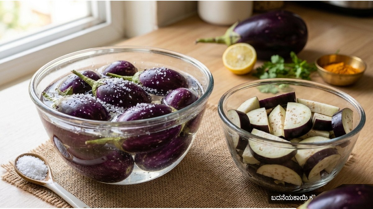 - ತಕ್ಷಣವೇ ಕತ್ತರಿಸಿದ ಬದನೆಕಾಯಿಯನ್ನು ಇದರಲ್ಲಿ ಹಾಕಿಡಿ.