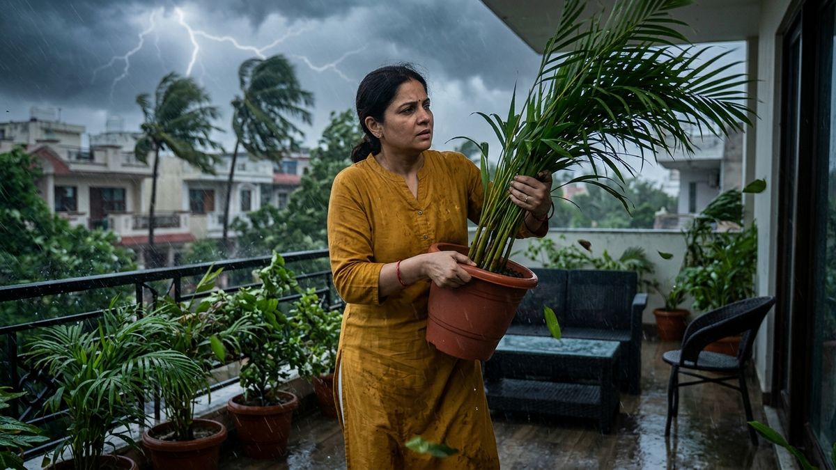 ಕೇವಲ ಹತ್ತು ನಿಮಿಷಗಳ ಸುರಕ್ಷತಾ ತಪಾಸಣೆ ನಿಮ್ಮ ಬಾಲ್ಕನಿಯನ್ನು ಹಾನಿಯಿಂದ ರಕ್ಷಿಸುತ್ತದೆ. ಮೊದಲು ಗಿಡದ ಕುಂಡಗಳನ್ನು ಭದ್ರಪಡಿಸಿ ಅಥವಾ ಅವುಗಳನ್ನು ನೆಲದ ಮೇಲೆ ಇರಿಸಿ. ಬಿಸಿಲಿನಿಂದ ರಕ್ಷಣೆ ನೀಡುವ ನೆಟ್ಗಳು ಅಥವಾ ಬಟ್ಟೆಯ ಮೇಲ್ಛಾವಣಿಗಳನ್ನು (Awnings) ಮಡಚಿಡಿ ಮತ್ತು ಬಲವಾದ ಹಗ್ಗಗಳಿಂದ ಕಟ್ಟಿ. ನೀರಿನ ಟ್ರೇಗಳಂತಹ ಸಣ್ಣ ವಸ್ತುಗಳು ಬಿರುಗಾಳಿಗೆ ಹಾರಿಹೋಗುವ ಸಾಧ್ಯತೆ ಇರುತ್ತದೆ. ಇವುಗಳನ್ನು ಮೊದಲೇ ತೆಗೆದಿಡುವುದರಿಂದ ಸಂಭವನೀಯ ಅಪಘಾತಗಳನ್ನು ತಪ್ಪಿಸಬಹುದು.