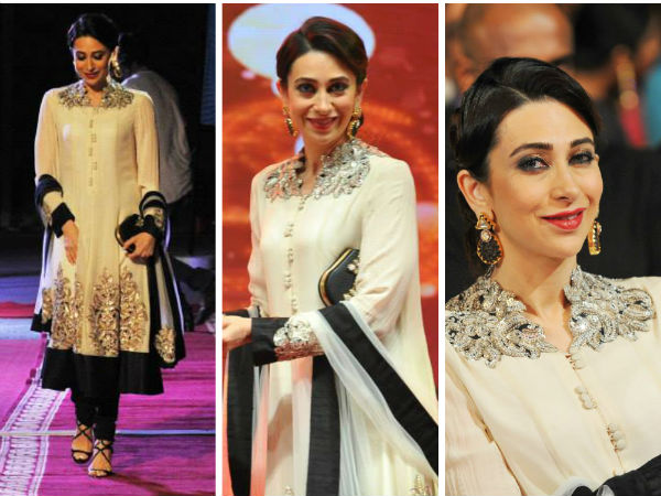 ನೂಪುರ್ ಕನೊಯಿಯ ಕಪ್ಪು ಮತ್ತು ಬಿಳಿ ಬಣ್ಣದ ಸೂಟ್ ನಲ್ಲಿ ಕರಿಷ್ಮಾ ಸುಂದರವಾಗಿ ಕಾಣುತ್ತಿದ್ದಳು. ಪಿಂಕಿ ಸರಾಫ್ ಕ್ಲಚ್, ಕ್ಯೂರಿಯೊ ಕಾಟೇಜ್ ನ ಕಿವಿಯೋಲೆ ಮತ್ತು ಜಿಮ್ಮಿ ಚೂ ಚಪ್ಪಲಿ ಧರಿಸಿದ್ದಳು. ಇದರೊಂದಿಗೆ ಚೆರಿ ಕೆಂಪು ಲಿಪ್ ಸ್ಟಿಕ್ ಮತ್ತು ಮೆಸ್ಸಿ ಬನ್ ಕೇಶವಿನ್ಯಾಸ ಮಾಡಿಕೊಂಡಿದ್ದಳು.