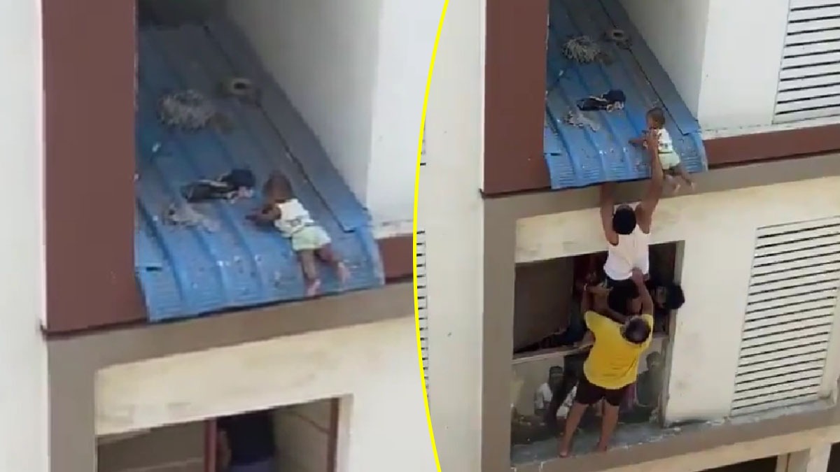 4ನೇ ಮಹಡಿಯಿಂದ ಬಿದ್ದ 7 ತಿಂಗಳ ಮಗು: ಅಪಾರ್ಟ್ಮೆಂಟ್ ನಿವಾಸಿಗಳು ರಕ್ಷಣೆ ಮಾಡುತ್ತಿರುವ ವೀಡಿಯೋ ವೈರಲ್