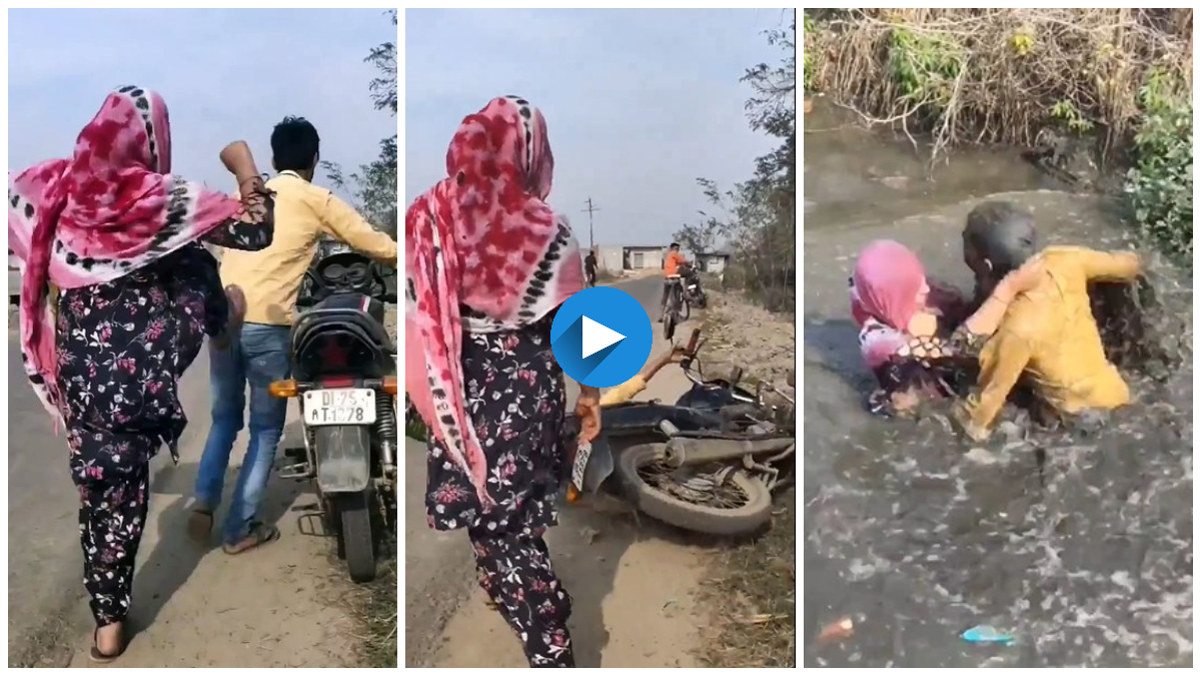 ಪತ್ನಿ ಬೈಕ್ ತಳ್ಳುತ್ತಿದ್ದ ಗಂಡನ ಬೆನ್ನಿಗೆ ಗುದ್ದುತ್ತಾಳೆ, ಇಲ್ಲಿಂದ ಜಗಳ ಆರಂಭವಾಗುತ್ತದೆ. ಇಬ್ಬರು ಕಿತ್ತಾಡಿಕೊಂಡು ಪಕ್ಕದ ಚರಂಡಿಗೆ ಬೀಳುತ್ತಾರೆ. ಅಚ್ಚರಿ ಅಂದ್ರೆ ಚರಂಡಿಗೆ ಬಿದ್ದರೂ ಜಗಳ ನಿಲ್ಲಿಸದೆ ಅಲ್ಲಿಯೂ ಕಿತ್ತಾಡಿಕೊಂಡಿದ್ದಾರೆ. ಜರಂಡಿ ನೀರಿನಲ್ಲಿ ಇಬ್ಬರೂ ಹೊಡೆದಾಡಿಕೊಂಡಿದ್ದಾರೆ.