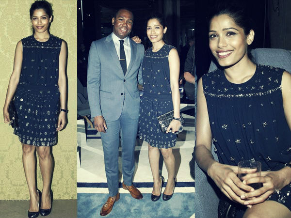 ಸುಂದರವಾದ ನೇವಿ ಬ್ಲ್ಯೂ ಬಣ್ಣದ ಮಿಯು ಮಿಯು ನಿಲುವಂಗಿಯನ್ನು ತೊಟ್ಟಿದ್ದ ಫ್ರೀಡಾ ದಿರಿಸಿನಲ್ಲಿ ಸಿಲ್ವರ್ ಚುಕ್ಕಿಗಳನ್ನು ಹೊಂದಿದ್ದರು. ಆಕೆಯ ಸಪೂರ ಕಾಲುಗಳನ್ನು ಚೆನ್ನಾಗಿಯೇ ತೋರಿಸಿರುವ ಈ ಮೊಣಕಾಲು ಉದ್ದದ ಅಂಗಿ ಅವರಿಗೆ ಹೇಳಿ ಮಾಡಿಸಿದಂತಿತ್ತು.