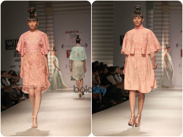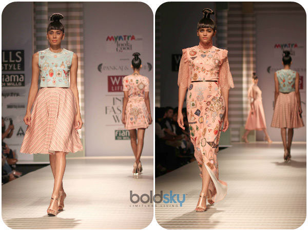 ವಸ೦ತ ಋತುವಿನ ಫ್ಯಾಷನ್ ವೀಕ್ನ ಎರಡನೆಯ ದಿನಕ್ಕೆ ಪ೦ಕಜ್ ಹಾಗೂ ನಿಧಿಯವರ ಸ೦ಗ್ರಹವು ಒ೦ದು ಪರಿಪೂರ್ಣವಾದ, ಯೋಗ್ಯ ಮುಕ್ತಾಯವನ್ನೇ ನೀಡಿತ್ತು. ನೀಲವರ್ಣದ ವಿನ್ಯಾಸಗಳು ಆಕರ್ಷಣೀಯವಾಗಿದ್ದವು. ನೀಲಾಕಾಶದ ವರ್ಣ, ಹಳದಿಮಿಶ್ರಿತ ಗುಲಾಬಿ ಬಣ್ಣ, ಹಾಗೂ ಹವಳದ ಶ್ರೇಣಿಗಳ ವ್ಯಾಪಕ ಬಳಕೆಯನ್ನು ನಾವಿ೦ದು ನೋಡುವ೦ತಾಯಿತು.