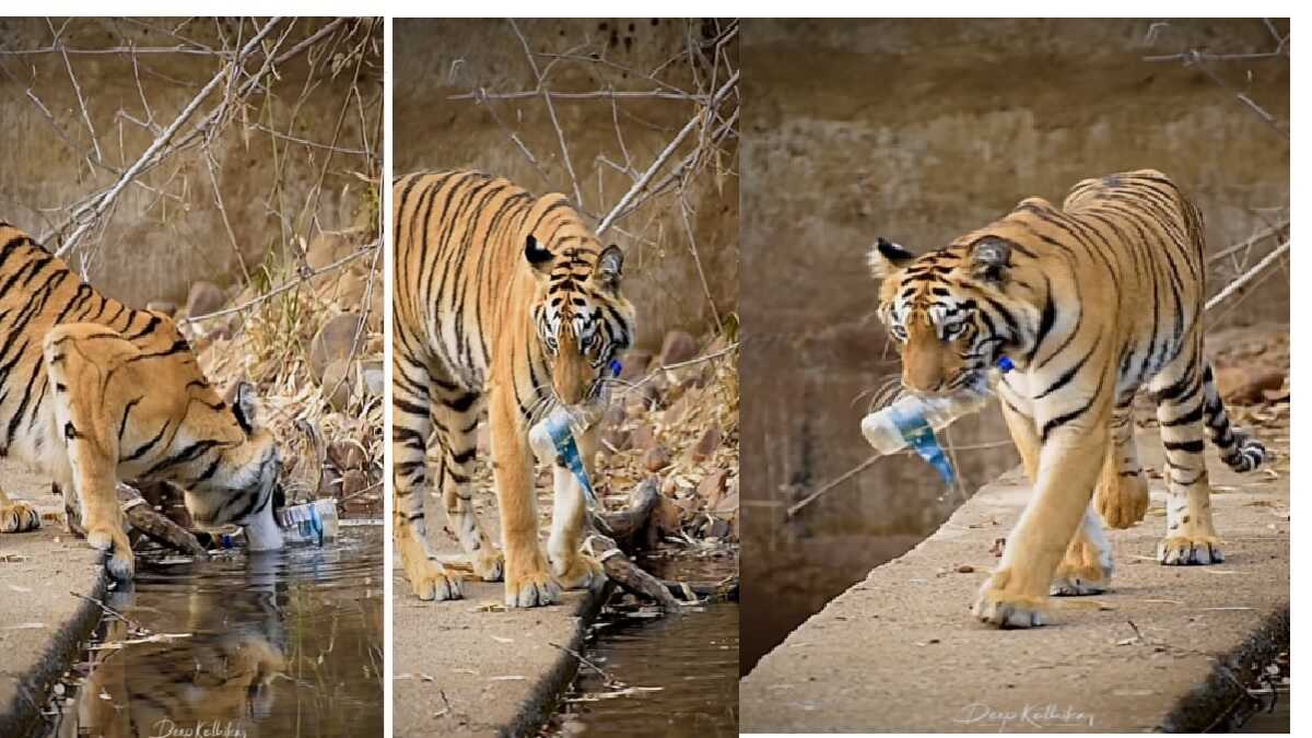 ಯಾರೋ ಬಾಟಲಿ ನೀರನ್ನು ಕುಡಿದು ಕಾಡಿನಲ್ಲಿರುವ ಕೊಳಕ್ಕೆ ಎಸೆದಿದ್ದಾರೆ, ಆದರೆ ಕೊಳಕ್ಕೆ ನೀರು ಕುಡಿಯಲು ಬರುವ ಹುಲಿ ಆ ಬಾಟಲಿಯನ್ನು ನೀರಿನಿಂದ ಕಚ್ಚಿ ಹೊರತೆಗೆದ ದೃಶ್ಯ ನಾಗರಿಕ ಸಮಾಜ ಯೋಚಿಸುವಂತೆ ಮಾಡಿದೆ. ಇದನ್ನು ವೈಲ್ಡ್ಲೈಫ್ ಫೋಟೋಗ್ರಾಫರ್ ದೀಪ್ ಕಾತಿಕಾರ್ ವೀಡಿಯೋ ತೆಗೆದಿದ್ದು ತಮ್ಮ ಸಾಮಾಜಿಕ ತಾಣದಲ್ಲಿ (Sweet gesture by the Tiger.