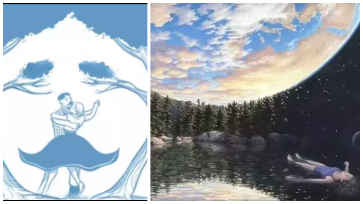 ಪಝಲ್ ತಜ್ಞ ಮಿಯಾ ಯಿಲಿನ್ ಅವರು ಹಂಚಿಕೊಂಡಿರುವ ಮೊದಲ ಚಿತ್ರದಲ್ಲಿ, ಮೊದಲು ನೀವು ಏನು ನೋಡಿದ್ದೀರಾ ಎಂಬುದನ್ನು ಗಮನದಲ್ಲಿಡಿ. ಈ ಚಿತ್ರವು ನೋಡುಗರಲ್ಲಿ ಹಲವು ರೀತಿಯ ಭಾವನೆ ಮೂಡಿಸಿದೆ. ಕೆಲವರಿಗೆ ಮೊದಲು ಇದು ಅನ್ಯಗ್ರಹದಂತೆ ಕಾಣಿಸಿದೆ. ಮತ್ತೆ ಕೆಲವರಿಗೆ ಆಕಾಶ ಮೊದಲ ಕಂಡಿದೆ. ಇನ್ನೂ ಹಲವರಿಗೆ ಕೊಳದಲ್ಲಿ ಬಿದ್ದಿರುವ ಮಹಿಳೆಯನ್ನು ಗುರುತಿಸಿದ್ದಾರೆ. ಇನ್ನೂ ಕೆಲವರು ರಾತ್ರಿಯ ಆಕಾಶದ ರಚನೆ ಗುರುತಿಸಿದ್ದಾರೆ.