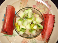 * ಕಲ್ಲಂಗಡಿ ಹಣ್ಣಿನ ಬಿಳಿ ಭಾಗವನ್ನು (ತಿರುಳನ್ನು) ಚೆನ್ನಾಗಿ ತೊಳೆದು ಸಣ್ಣ ಹೋಳುಗಳನ್ನಾಗಿಸಿಟ್ಟುಕೊಳ್ಳಬೇಕು.