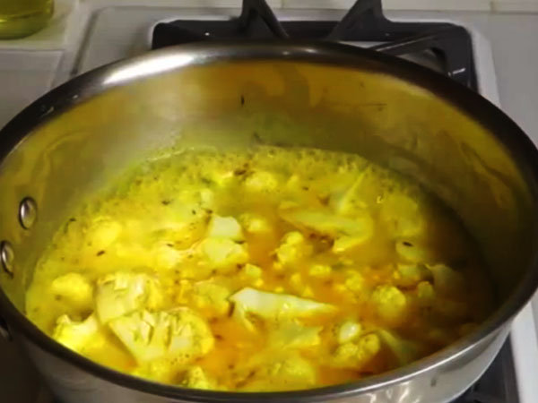 5. ಇದಕ್ಕೆ ನೀರು ಮತ್ತು ಉಪ್ಪನ್ನು ನಿಮ್ಮ ರುಚಿಗೆ ತಕ್ಕಷ್ಟು ಬೆರೆಸಿಕೊಳ್ಳಿ. ನಂತರ ಇದಕ್ಕೆ ಬೆಂದ ಹೂಕೋಸುಗಳನ್ನು ಹಾಕಬೇಕು. ಈ ತರಕಾರಿಗಳು 18 ನಿಮಿಷ ಬೇಯಲು ಬಿಡಿ. ಇದು ಬೆಂದ ಮೇಲೆ ಉರಿಯನ್ನು ಆರಿಸಿ, ಇದರ ಮೇಲೆ ಗರಂ ಮಸಾಲ ಮತ್ತು ಕೊತ್ತಂಬರಿಯನ್ನು ಚಿಮುಕಿಸುವ ಮೂಲಕ ಅಲಂಕರಿಸಿ
