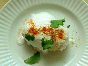 5. ಮೊಸರನ್ನು ಚೆನ್ನಾಗಿ ಕದಡಿ ಗರಂ ಮಸಾಲ, ಉಪ್ಪು ಮತ್ತು ಕೆಂಪು ಮೆಣಸಿನ ಪುಡಿ ಹಾಕಬೇಕು. ಇದನ್ನು ವಡೆ ಮೇಲೆ ಸುರಿದು ಹುಣಸೆ ಹಣ್ಣಿನ ರಸವನ್ನು ಅದರ ಮೇಲೆ ಚಿಮುಕಿಸಬೇಕು.